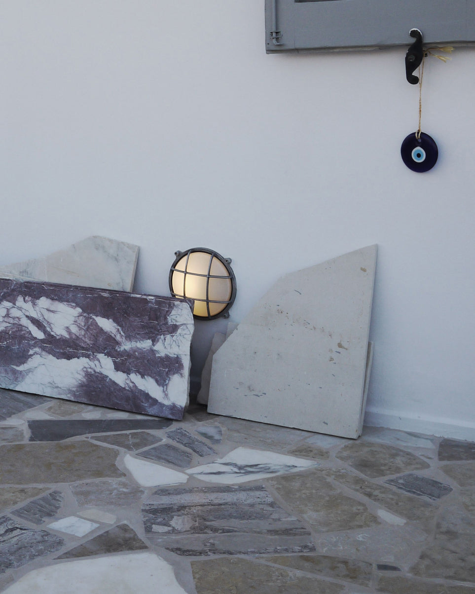 The robust charm of our Bulkhead Lights takes center stage in the communal areas of Nada’s home, their industrial edge providing a bold contrast to the traditional Grecian architecture. Their warm, functional glow enhances the character of the space, highlighting its blend of rustic elegance and modern flair.