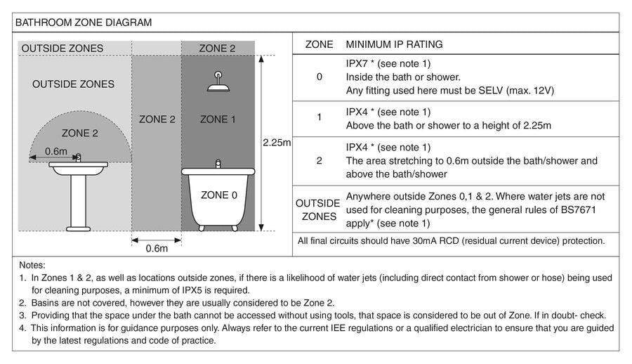 *Any light fitting intended for bathroom use must be installed by a qualified electrician and connected to a 30mA RCD final circuit. If in any doubt, we recommend consulting them over the suitability of a light fitting for bathroom installation prior to ordering.