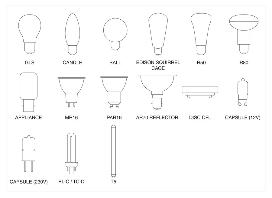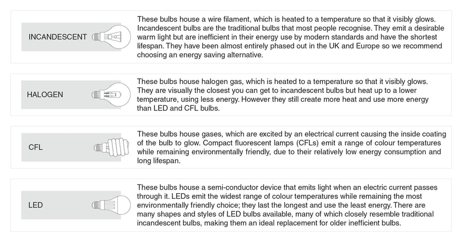 Alternatively, the following information should help you choose the most suitable bulb for you and your light. Below is an explanation of the main types of light bulbs available. We recommend using LED lamps in all our products, as they produce as much light as traditional bulbs but use a fraction of the power and last substantially longer.