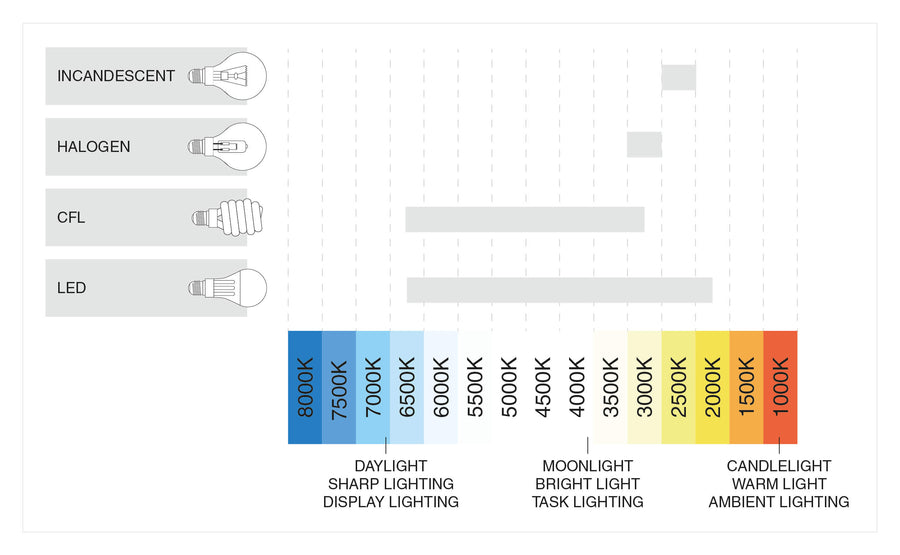 Kelvins are the unit used to describe the colour temperature of the light emitted from the bulb. The table below highlights the range of colour temperatures different bulbs produce. Incandescent and halogen bulbs only give out one specific colour of light whilst CFL’s and LED’s provide a range; this means you can choose a suitable Kelvin rating based on the application of your product. ‘Blue’ light is typically used for display lighting, ‘white’ light is typically used for task lighting and a warmer ‘yellow’ light offers a warm and ambient light. We recommend using LED bulbs in all our products.
