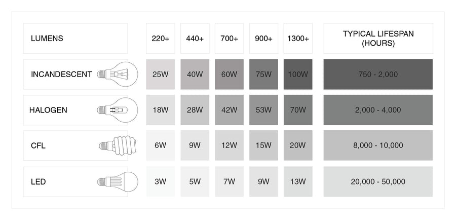 Lumens are a measure of the total amount of visible light to the human eye from a lamp or light source. The higher the Lumen value, the brighter the light output. The table below highlights the Lumen output of various bulb types at specific wattages.