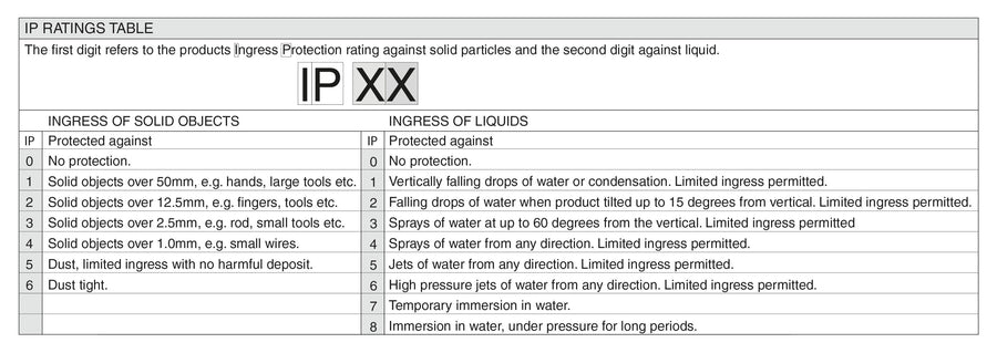 ‘IP’ stands for ‘Ingress Protection’ and is used to rate and classify the degree of protection to a light’s electrical connections against ingress of contact with particles, dust, and water. Some locations, such as bathrooms and exteriors, require a light to meet a minimum IP rating to ensure they are safe to operate. The first digit refers to the product’s ingress rating against solid particles. The second digit refers to the product’s ingress rating against liquids.